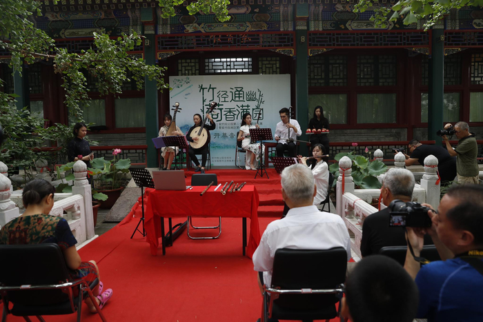 今天上午,竹荷文化展开幕音乐会在紫竹院行宫古银杏树下举办,由国韵民乐团的青年艺术家为大家演出《紫竹调》、《行街》、《花好月圆》等江南丝竹传统曲目,并邀请海淀实验中学吟诵团的同学们带来诗词吟诵《爱莲说》。