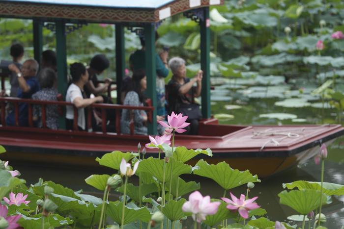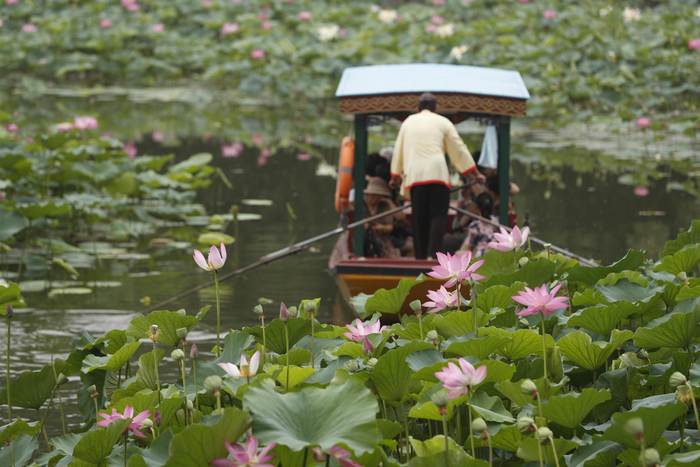 夏日里,紫竹院公园荷花渡景区也格外受游客欢迎。荷花渡景区从上世纪60年代开始引进荷种,已有50余年的荷花栽培史,由于泥土肥沃、水位温度适宜,这里的荷花生长得格外繁茂,成为紫竹院公园的一大特色。游客既可在公园南小湖北岸水上莲花栈桥、北小湖南岸亲水平台上观荷拍照,也可在白洋淀老船工摇橹的荷花摆渡上游湖,近距离观赏荷花。