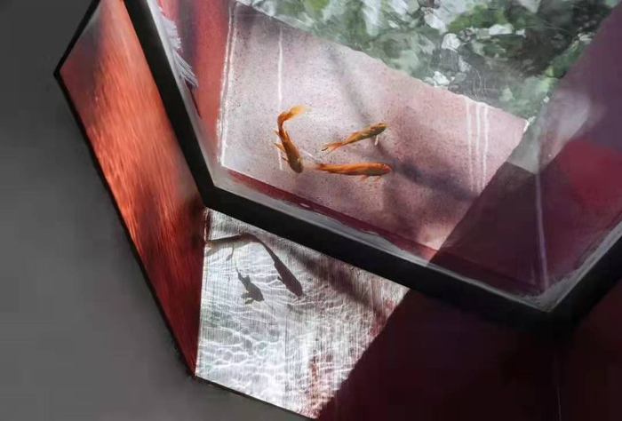 鲜活的锦鲤在屋顶恣意穿梭,阳光透过树的罅隙投射进来,如此奇观,令人不禁拍案叫绝。沿着蜿蜒曲折的阶梯走到二楼的露台,便会发现“玄机”所在。二楼有一个密闭的透明空间,里面养着几条小锦鲤。人们从楼下望向天花板,就会看到鱼儿在房顶游动的“奇观”。