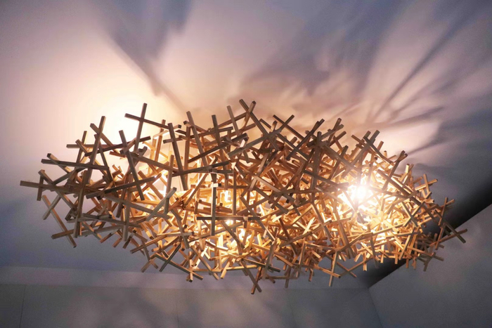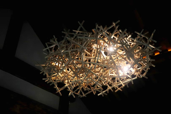 最吸引京蜜的还是屋顶的“云灯”。“云灯”是中西元素巧妙融合的产物,它是由中国传统的榫卯结构组成,看似复杂,却有着极简的意境。“云灯”的设计者老郎,是“我宅”的创始人之一,他告诉我们,在不同空间里,“云灯”的光会呈现出不同的散射方式,光与影可以通过无限的介质变幻出不同的形态,从而实现空间的分割与重组,妙趣横生。