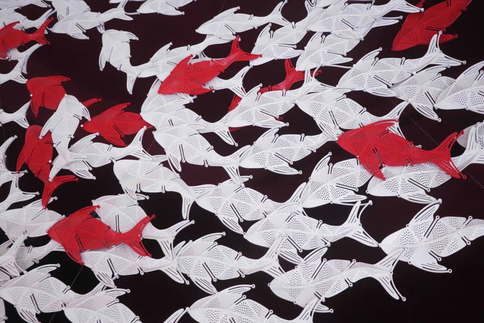 除了真实游动的鱼儿,在“宅GD”一楼还有个红白相间的“游鱼”墙。之所以有这样的设计,是因为创始人丹青对苏州园林中的假山鱼塘情有独钟。在这面墙上,红色的鱼混迹在一群白色的鱼中,也有着传统文化与现代文化交相融合的意味。