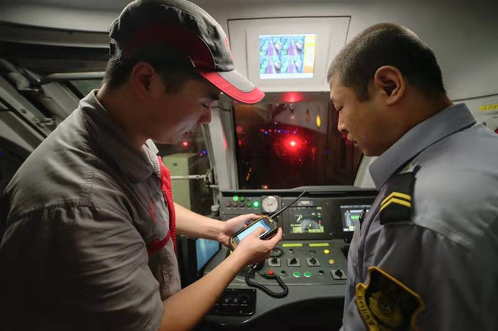2019年7月20日凌晨,古城地铁车辆段,检修人员与机长进行交接。新京报记者郑新洽/摄