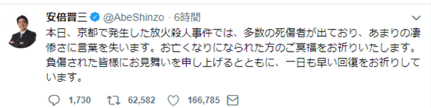 日本首相安倍晋三就此事发布推特表达哀悼和惋惜,他在推特中说:“今天,在京都发生的纵火杀人事件中有很多死伤者,惨状已让我失语。我为死难者祈福。同时,也对受伤者致以慰问,希望大家早日康复。”