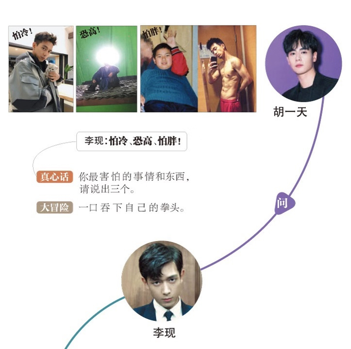 而在今年7月1日刊发的新京报演员新势力栏目100期中,李现不但参与了隔空真心话&大冒险,接受《亲爱的,热爱的》中吴白的扮演者胡一天的挑战,分享了真心话——自己最怕的三样东西:“怕冷、恐高、怕胖!”还透露了这两年的心态变化。