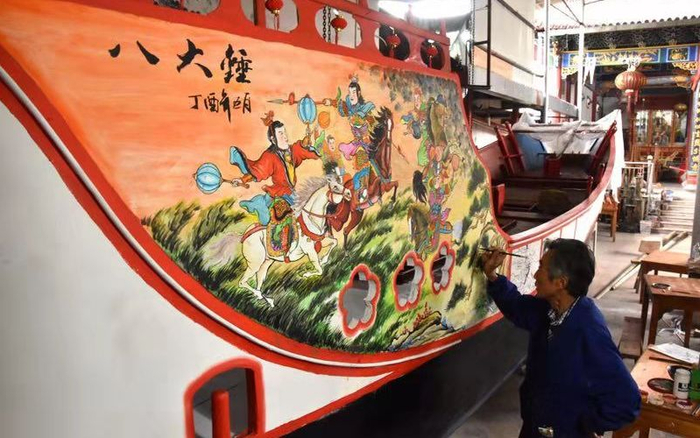 一同被抬起送至海边的还有大暑船。船上不仅载有猪、羊、鸡、鱼、酒等代表祭祀的食品,还有水缸、桌、椅、棉被等生活用品。有时还能在船上看到代表着水手、枪炮手、船长等角色的木偶、玩具作品。