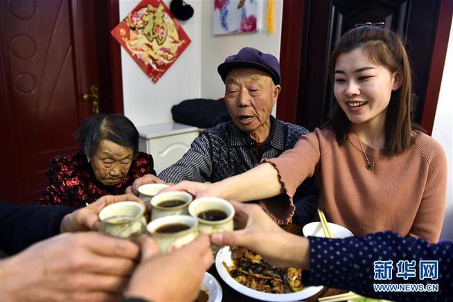 2018年2月15日,在山西省岢岚县广惠园小区,刘福有(中)和家人在吃年夜饭。(詹彦 摄)