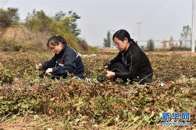 在山西潞安集团油用牡丹育苗基地,石圪节煤矿工人在苗圃里分拣牡丹苗(2016年10月11日摄)。(詹彦 摄)