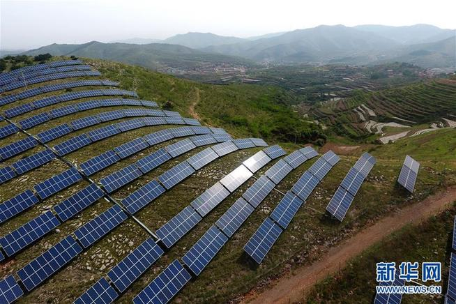山西省长治市平顺县龙溪镇光伏扶贫电站(2018年5月18日无人机拍摄)。 (詹彦 摄)