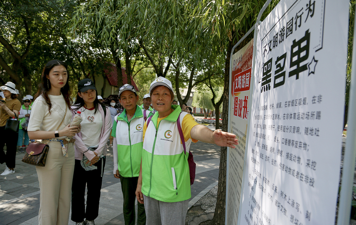 即日起,各大公园将在公园门区、广场、景点等显要位置广泛张贴“倡议书”和“黑名单”,并通过广播等形式进行宣传,引导游客自觉文明游园。