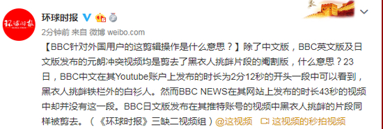[BBC针对外国用户的这剪辑操作是什么意思?]除了中文版,BBC英文版及日文版发布的元朗冲突视频均是剪去了黑衣人挑衅片段的阉割版,什么意思?23日,BBC中文在其Youtube账户上发布的时长为2分12秒的开头一段中可以看到,黑衣人挑衅铁栏外的白衫人。然而BBC NEWS在其网站上发布的时长43秒的视频中却并没有这一段。BBC日文版发布在其推特账号的视频中黑衣人挑衅的片段同样被剪去。