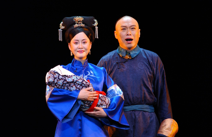 北京曲剧《正红旗下》演出剧照,卢雪文饰母亲(图左),孙宁饰父亲(图右)。北京市曲剧团供图