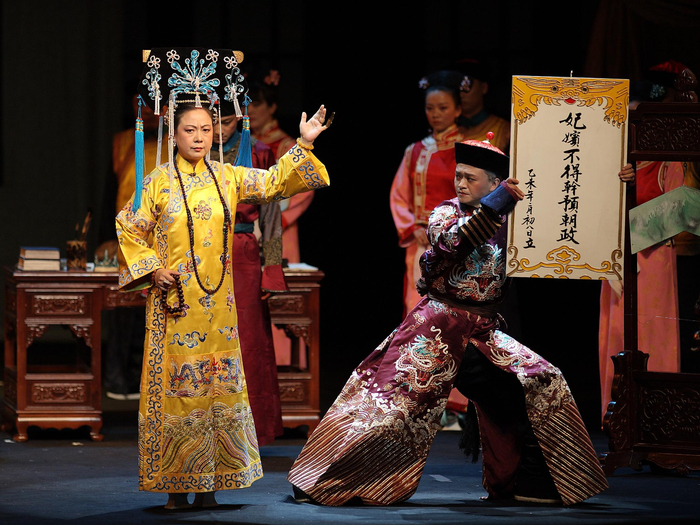 《珍妃泪》演出,甄莹(图左)饰演慈禧太后。北京市曲剧团供图