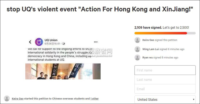 此外,观察者网注意到,国外请愿网站change上,已有自称“中国留学生”人士发帖,要求校方就这次的反华游行做出解释。