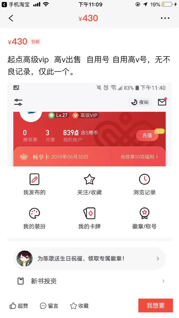 买过小说VIP账号的网友则吐槽现在价格“虚高”。网友“纯纯”称,2018年起点中文网的VIP账号只需40元一个,今年有卖家已经要价368元。“原来大批量买VIP号,合下来每个账号也就十几块钱,就算封号也不心疼。现在查得严,资源少了很多。”她说。