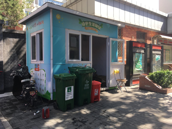 作为垃圾流动收集车的补充,建国门街道内共有8个绿色生活驿站,运营时间为每天早7点到晚7点,收集厨余垃圾、可回收垃圾和有害垃圾。