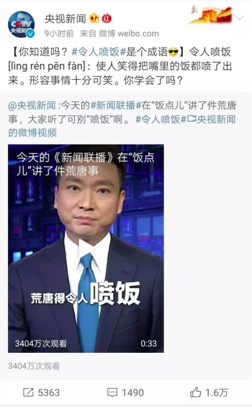 昨天的《新闻联播》在“饭点儿”讲了件荒唐事。“令人喷饭”一词引发热议。