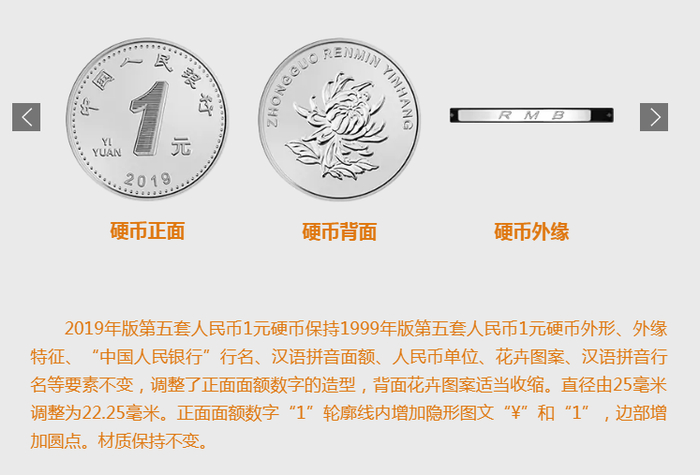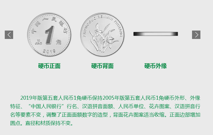 2019年版第五套人民币1元、5角、1角硬币分别保持1999年版第五套人民币1元、5角硬币和2005年版第五套人民币1角硬币外形、外缘特征、“中国人民银行”行名、汉语拼音面额、人民币单位、花卉图案、汉语拼音行名等要素不变,调整了正面面额数字的造型,背面花卉图案适当收缩。