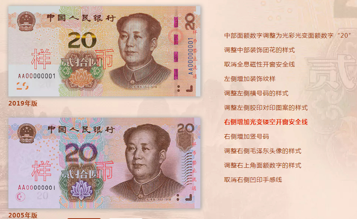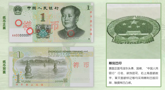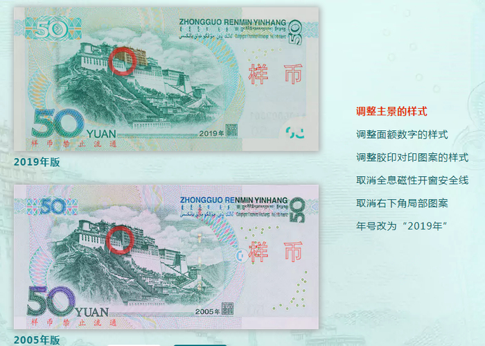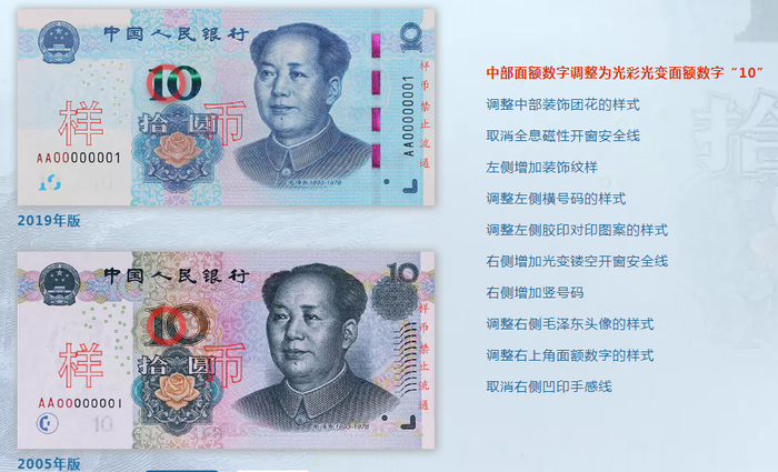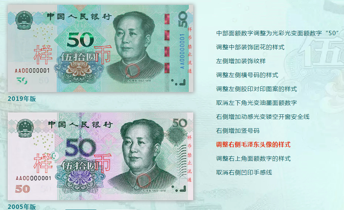 2019年版第五套人民币50元、20元、10元、1元纸币分别保持2005年版第五套人民币50元、20元、10元纸币和1999年版第五套人民币1元纸币规格、主图案、主色调、“中国人民银行”行名、国徽、盲文面额标记、汉语拼音行名、民族文字等要素不变,提高了票面色彩鲜亮度,优化了票面结构层次与效果,提升了整体防伪性能。2019年版第五套人民币50元、20元、10元、1元纸币调整正面毛泽东头像、装饰团花、横号码、背面主景和正背面面额数字的样式,增加正面左侧装饰纹样,取消正面右侧凹印手感线和背面右下角局部图案,票面年号改为“2019年”。