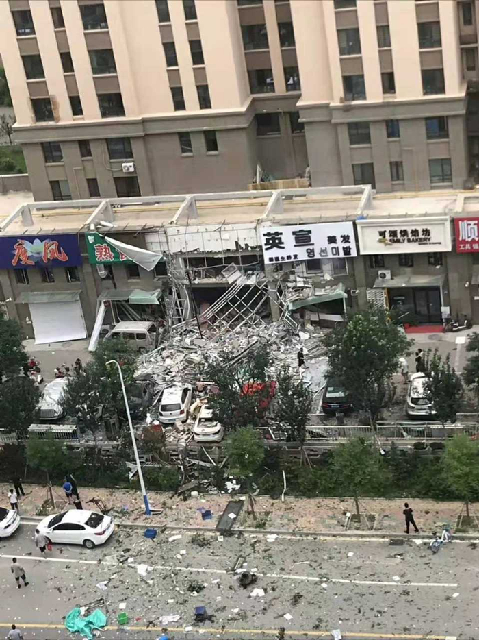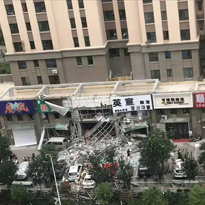 新京报此前报道,事发底商附近多家商铺外立面损毁,招牌、墙面倒塌,马路上可见大量碎裂物。商铺外停放的多辆车车身受损,玻璃碎裂。消防、公安等部门正在现场救援。