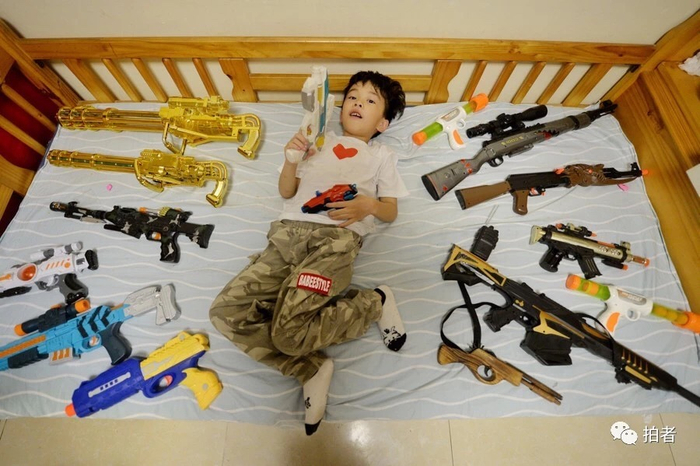 元宝家中,桌椅底下塞满了他的玩具,床上,整齐摆着他最喜欢的玩具枪,宛如小型“玩具博物馆”。元宝妈妈说:“除了玩,他每天还是要做数学题的,一天一百道,错一道打三下手掌。”