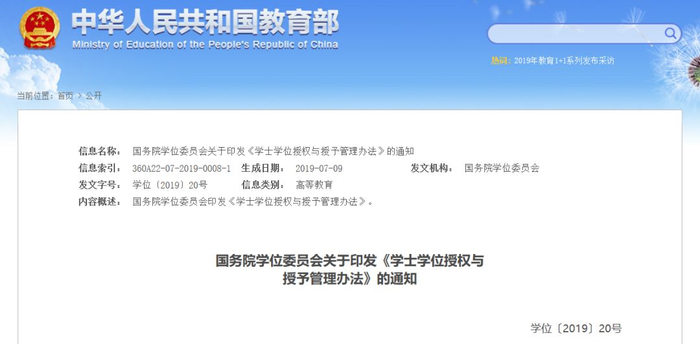 7月26日,教育部官网发布《学士学位授权与授予管理办法》,对学士学位授权授予、学士学位管理等作出进一步规范。