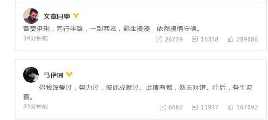 新京报讯(实习记者 任婉晴 记者 林子)7月28日下午,文章发布微博称,“吾爱伊琍,同行半路,一别两宽,余生漫漫,依然亲情守候。”随后,马伊琍也发文:“你我深爱过,努力过,彼此成就过。此情有憾,然无对错。往后,各生欢喜。”二人正式宣布离婚。