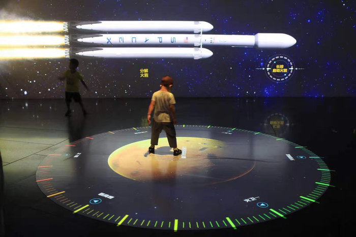 火星交互展上,小朋友在猎鹰火箭的背景下参与交互项目。新京报记者 浦峰 摄