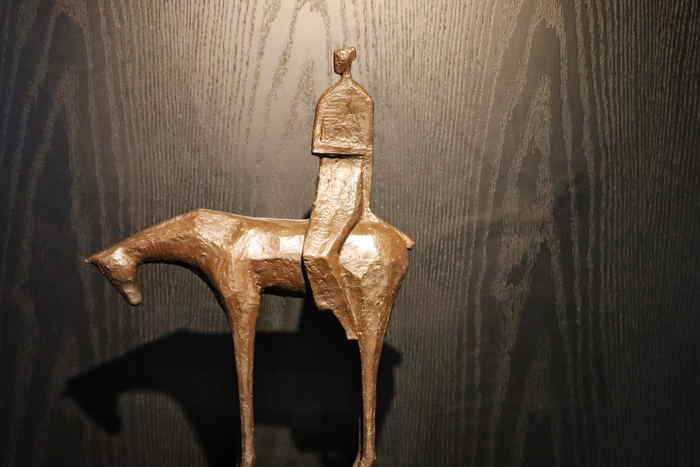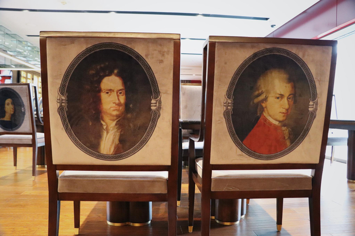 “宋朝女子”侧坐骑马,背对传记咖啡馆缓缓行进,咖啡馆座椅背面是贝多芬与莫扎特的画像。编钟十六枚、编磬十六枚与钢琴、大提琴是背道而驰还是“殊途同归”?