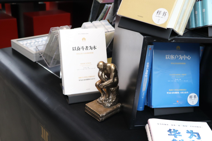 “思想者”置身于现代管理书籍之中,旁边是以华为公司人力资源纲要为蓝本的《以奋斗者为本》。