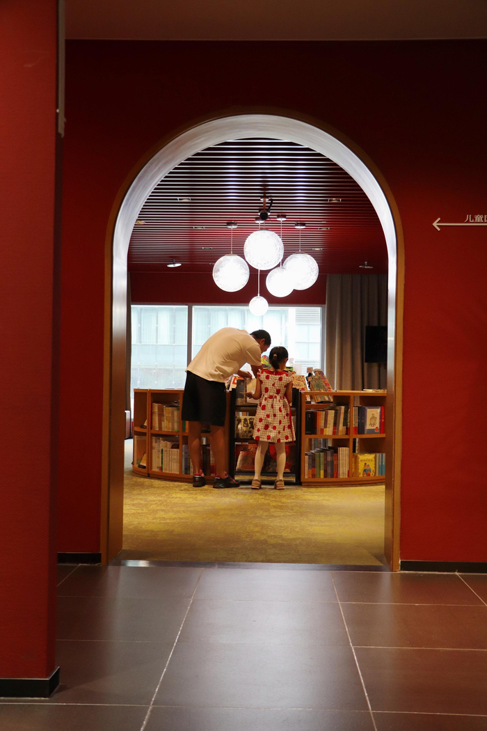 站在绿植墙旁边,遥见儿童阅读区“拱门”里的一对父女。父亲正在耐心陪伴女儿选书,这一幕显得格外温情。亲子关系不止于陪伴阅读,更是思想与学识的交汇。