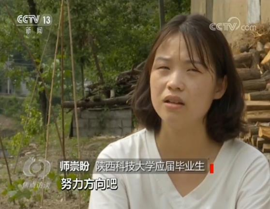 师崇盼是陕西科技大学经济与管理学院市场营销专业的应届毕业生,她就是一名来自农村的“建档立卡”贫困生。陕西省安康市白河县是一个国家级贫困县,师崇盼家所在的太和村更是深度贫困村。这里是山区,没有耕地,村里人的主要收入来源都是靠在外面打工。