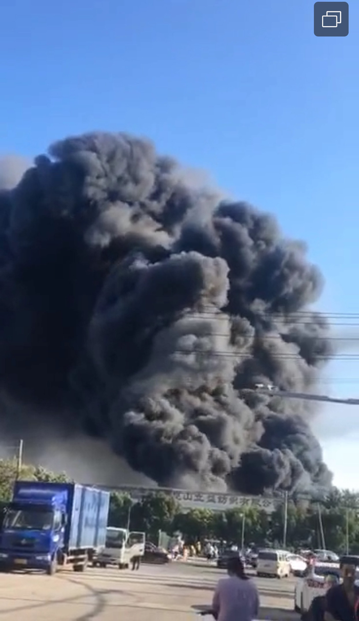现场视频显示,一处写有“昆山立益纺织有限公司”的围墙内,有滚滚浓烟冒出,达10余米高,浓烟中夹杂着明火。事发地点紧邻马路,路上停放在多辆货车,不时有行人在事发地点附近穿梭。