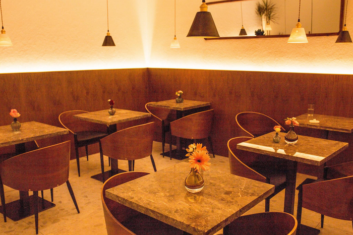 “简单如一,越简单越纯粹。”如果是第一次来,你大概会误以为自己进了一间咖啡馆吧?推门即见,开放式厨房里,3位店员穿着简洁干净的衬衫在忙碌着。轻音乐流水一样穿过绿植、干花,还有大理石餐桌上的小朵鲜切花。环顾仅有40平方米的就餐区域,餐椅、护墙板,还有托盘,都采用了统一的胡桃木材质。连墙面也被一丝不苟地抹上了日本硅藻泥。