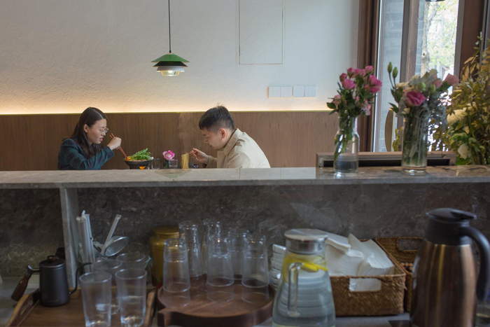 苏倩告诉新京报记者,设计师曾建议她把桌子的宽度设计成60到65厘米,这样足够放置12到14张桌子,但她却把尺寸加到了70厘米,最终只做了8张桌子。为什么要多上10厘米的距离呢?“我想把环境做得舒服些。”苏倩说,虽然这只是一家面馆,但却可以同日料一样做出高品质、吃出仪式感。
