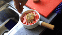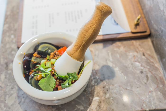 先说这道泰国荷包蛋沙拉。它是老板苏倩在泰国旅游时,报厨师班学来的。看起来它就比普通的沙拉要精致不少。海鲜酱、大蒜、小辣椒,这几种食材都是货真价实的泰国货。至于水果汁、盐、糖等各种调料,哪个先撒,放多少,都是有讲究的。最后一步也挺关键,还容易忘,那就是加两瓣青柠檬。
