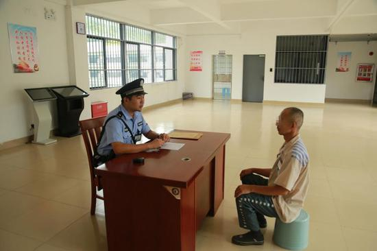 (监狱民警对刘某华做释放前谈话 供图:广东省肇庆监狱)