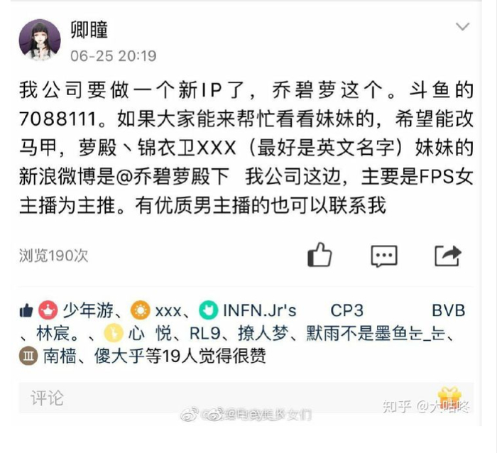 疑似该主播经纪人的QQ则在6月25日时就称,“我们公司要做一个新IP ,乔碧萝殿下,斗鱼7088111,主要是FPS女主播主推。”7月5日,该人士称,“这波纯做人设崩塌,别留言”。上述人士还在7月25日称,“特别企划:与十万喷子共进退,斗鱼7088111。”该QQ号为“乔碧萝殿下”的微博简介显示:经纪人QQ323087***。