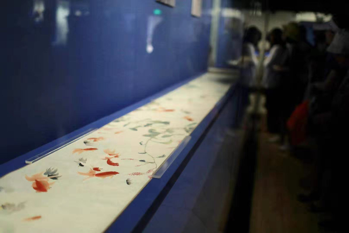 展览分鱼之乐、鱼之意、鱼之器三个单元。“鱼之乐”单元以带有生动金鱼图案的瓷器与织绣类文物为主,其中一幅长达13米的《金鱼百影图卷》,由著名文物鉴赏家王世襄的母亲金章女士于1909年所绘,笔墨灵动秀润。