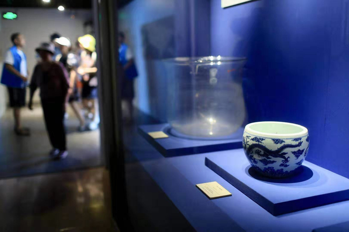 “鱼之器”单元展示了清代宫廷使用过的鱼缸,材质有瓷、珐琅、玻璃、铜等。此次展出的有清代康熙、雍正、乾隆、同治四朝的青花云龙纹鱼缸。
