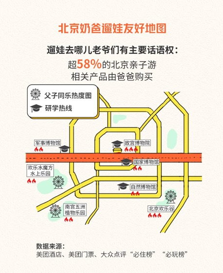 美团门票的数据显示,在上海、北京、广州、杭州、天津生活压力越大的城市,奶爸越懂得“带娃看世界”的重要,这五座城市也是男性亲子游产品购买力的TOP5。其中,天津的亲子游相关产品,由男性用户购买的占比超80%,北京的亲子游相关产品中,男性用户订购占比超58%。