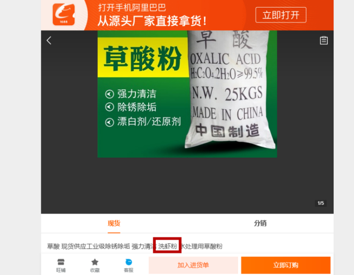 不仅如此,新京报记者还在阿里巴巴1688批发网发现,有多名商家在销售工业级草酸时,商品关键词直接标明为洗虾粉。