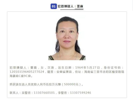 警方通报内容显示,董霞1964年出生,籍贯为安徽省萧县,住在海南省三亚市吉阳区一小区。