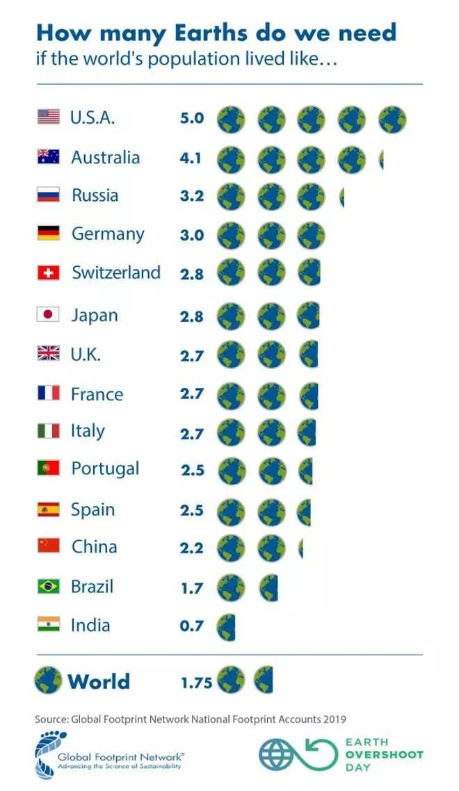 而若是按国家消耗自然资源的速度来看,这个数据显得更为“吓人”。据“全球足迹网络”数据,若是人类像美国人这般消耗自然资源,需要5个地球才能支撑;若是像澳大利亚,需要4.1个地球;若是像英国、法国、意大利,则需要2.7个地球。