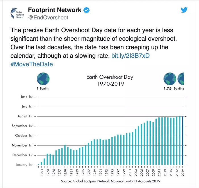 据国际环保组织“全球足迹网络”(Global Footprint Network )最新报告,7月29日是2019年“地球透支日”,也即,到这一天,人类已经用光了2019年的自然资源定量,其中包括水、土壤、清洁空气等等。