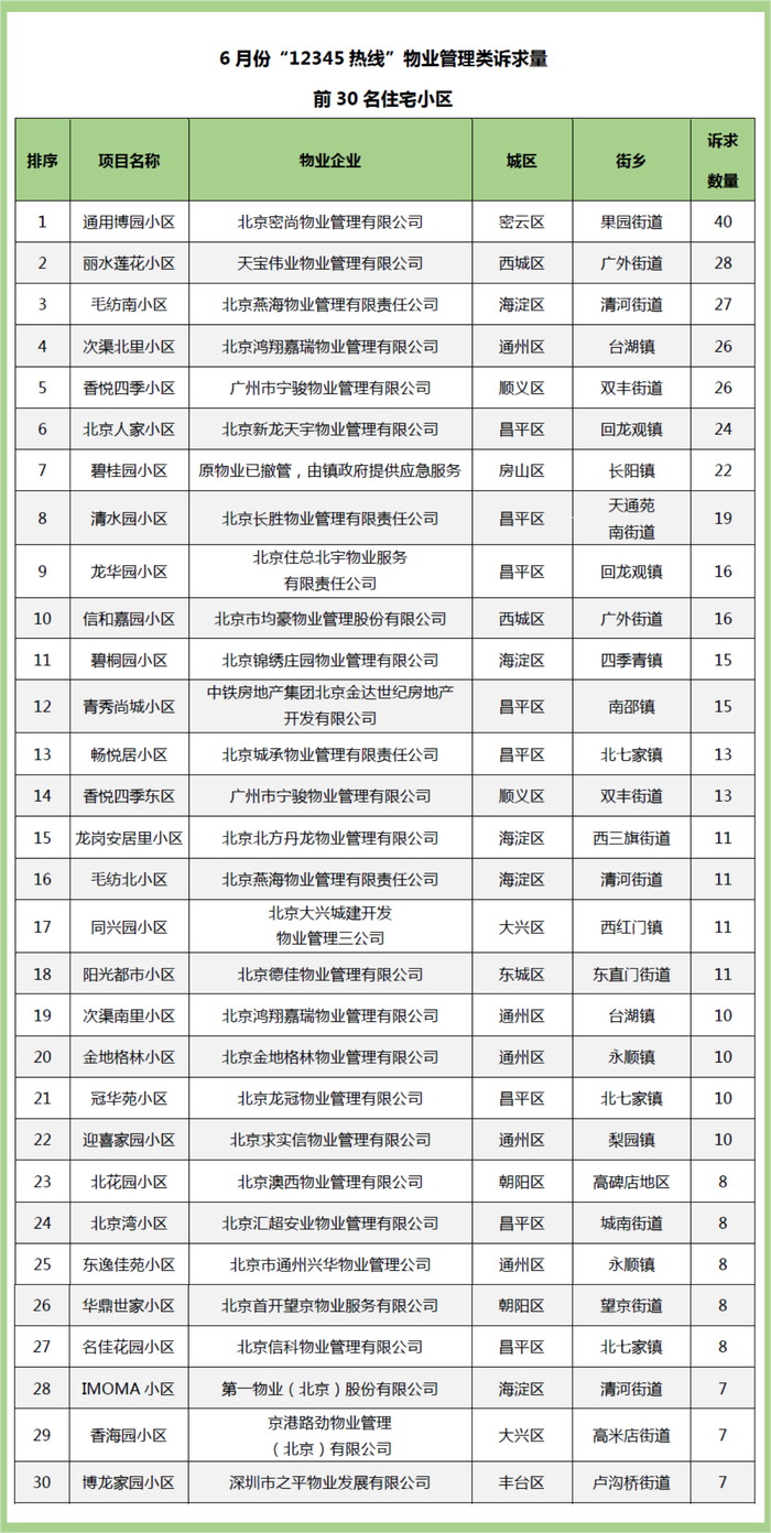 7月31日,北京市住房和城乡建设委员会通过对市政务服务局提供的市民热线数据进行系统梳理,整理出6月份“12345”市民热线物业类诉求量排前30名的住宅小区及物业服务企业名单,并予以公布。
