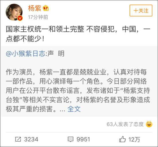 此后,女主角杨紫的工作室@小猴紫日志 发布声明,称杨紫本人及团队始终坚持一个中国原则,坚决维护祖国统一;并称有网络用户散布“杨紫支持台独”相关不实言论,希望广大网友辩清事实,不信谣不传谣。