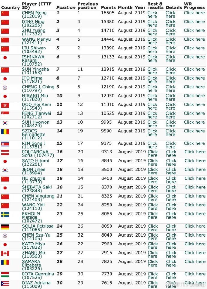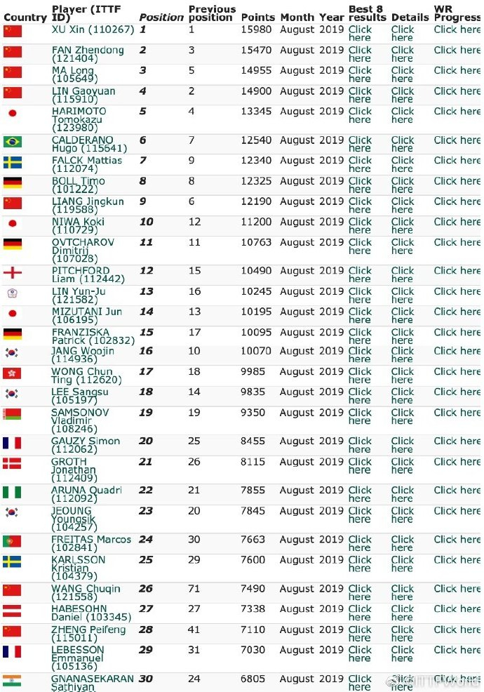 原标题:国际乒联公布8月世界排名,许昕陈梦维持第一