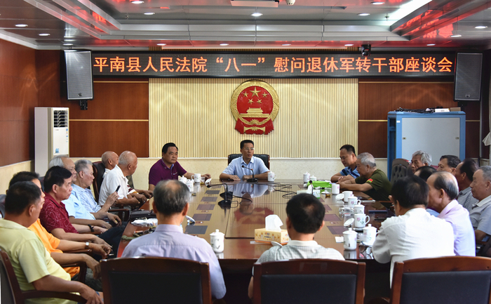 2019年7月31日,平南县人民法院组织在法院工作的退役军人召开座谈会。院党组书记、院长覃干义,院党组副书记、副院长万启福,党组成员林伟禄以及17名退休军转干部参加了座谈会。