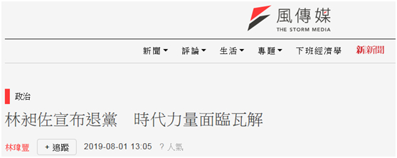 台湾“中央社”7月30日曾报道,黄国昌曾抛出如果“时代力量”当小绿,他就要离开,以及与“时代力量”关系密切的“太阳花”头目林飞帆接下民进党副秘书长职位,让“时代力量”路线之争问题浮上台面。台媒“风传媒”更在报道中称,“林昶佐宣布退党 时代力量面临瓦解”。