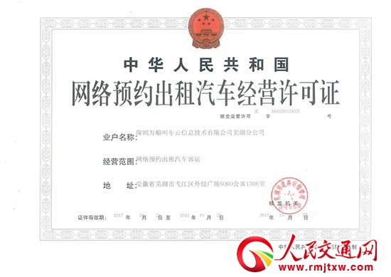 人民交通讯(记者|石忠平)2017年10月23日,记者从安徽省芜湖市交通运管部门获悉,万顺叫车获芜湖市交通运输局颁发的《网络预约出租汽车经营许可证》。
